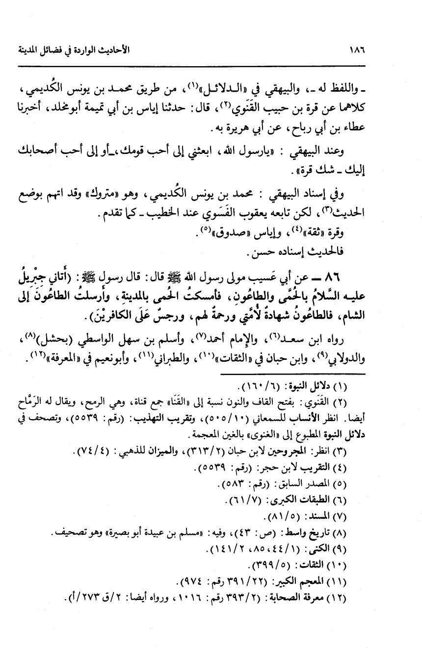 86 - عن أبي عسيب مولى رسول الله صلى الله عليه وسلم قال: قال رسول الله صلىالله عليه وسلم: (اتأني جبريل عليه السلام بالحمى والطاعون، فأمسكت الحمى بالمدينة، وأرسلت الطاعون إلى الشام، فالطاعون شهادة لامتي ورحمة لهم، ورجس على الكافرين).