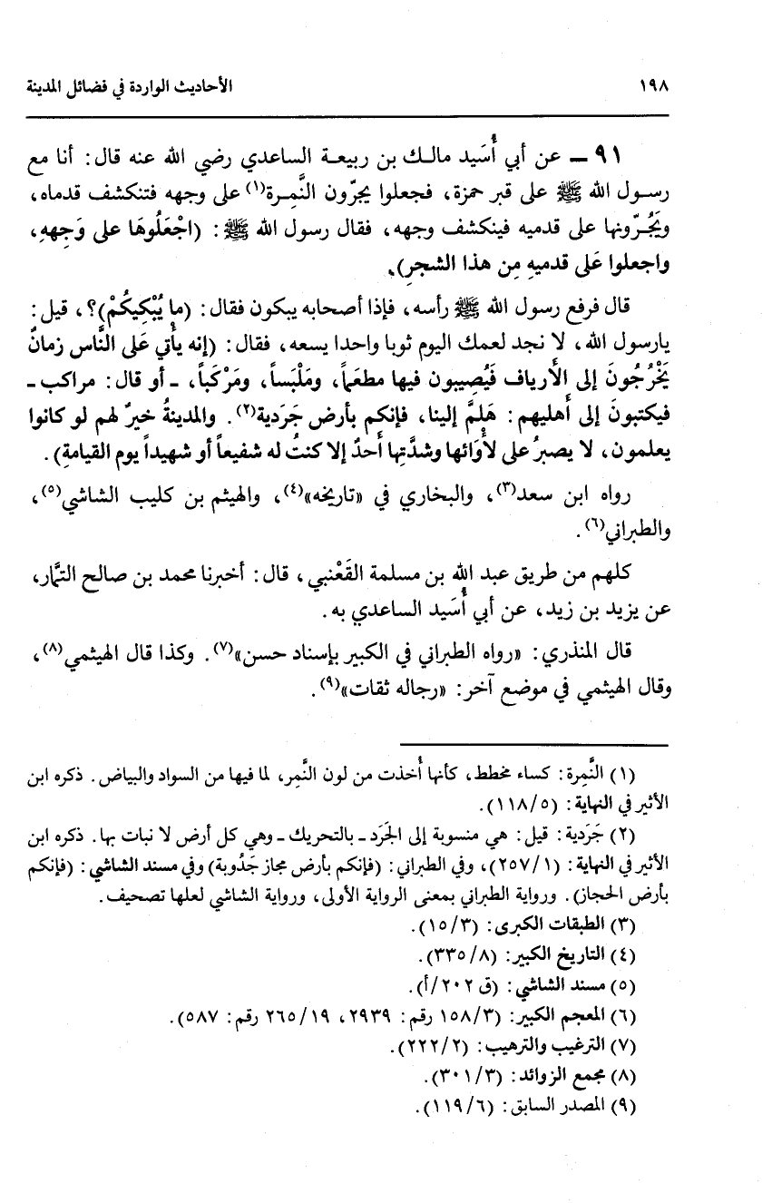 91 - عن أبي أسيد مالك بن ربيعة الساعدي رضي الله عنه قال: أنا مع رسول الله صلى الله عليه وسلم على قبر حمزة، فجعلوا يجرون النمرة (1) على وجهه فتنكشف قدماه، ويجرونها على قدميه فينكشف وجهه، فقال رسول الله صلى الله عليه وسلم: (اجعلوها على وجهه، واجعلوا على قدميه من هذا الشجر).