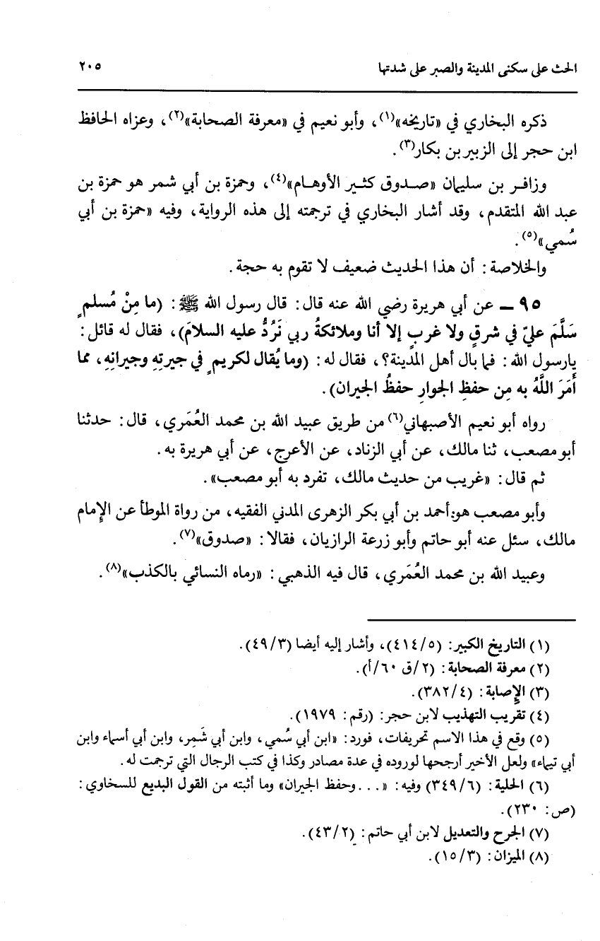 95 - عن أبي هريرة رضي الله عنه قال: قال رسول الله صلى الله عليه وسلم: (ما من مسلم سلم علي في شرق ولا غرب الا انا وملائكة ربي نرد عليه السلام)، فقال له قائل: يا رسول الله: فما بال أهل المدينة؟، فقال له: (وما يقال لكريم في جيرته وجبرانه، مما أمر الله به من حفظ الجوار حفظ الجيران).