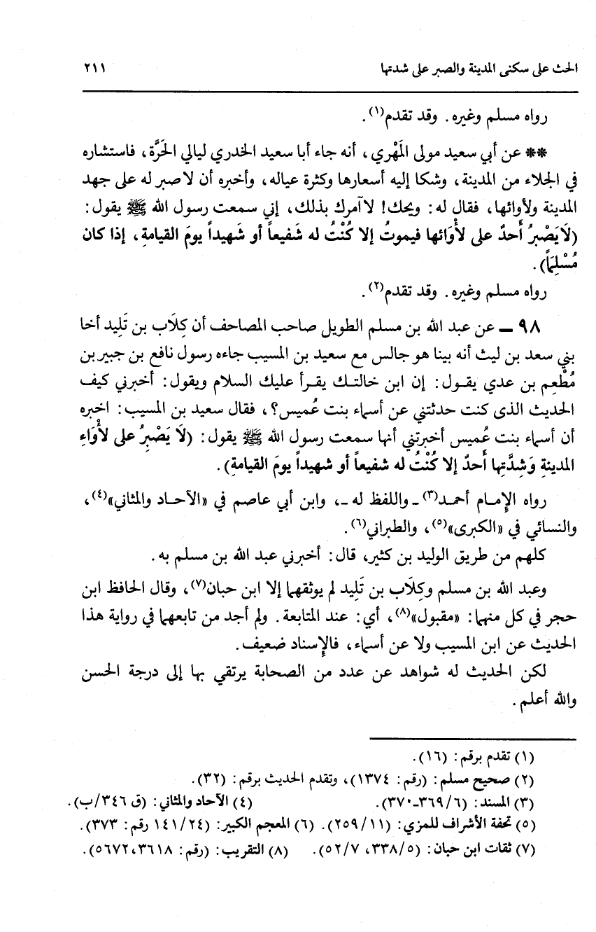 98 - عن عبد الله بن مسلم الطويل صاحب المصاحف أن كلاب بن تليد أخا بني سعد بن ليث أنه بينا هو جالس مع سعد بن المسيب جاءه رسول نافع بن جبير بن مطعم بن عدي يقول: (إن ابن خالتك يقرأ عليك السلام ويقول: أخبرني كيف الحديث الذي كنت حدثتني عن أسماء بنت عميس؟، فقال سعيد بن المسيب: أخبره أن أسماء بنت عميس اخبرتني أنها سمعت رسول الله صلى الله عليه وسلم يقول: (لا يصبر على لاواء المدينة وشدتها أحد الا كنت له شفيعاً او شهيدا يوم القيامة).