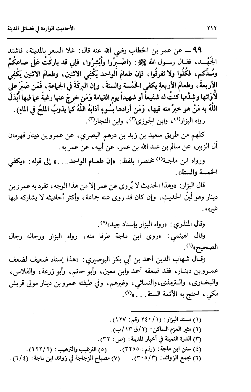 99 - عن عمر بن الخطاب رضي الله عنه قال: غلا السعر بالمدينة، فاشتد الجهد، فقال رسول الله صلى الله عليه وسلم: (اصبروا وابشروا، فإني قد باركت على صاعكم ومدكم، فكلوا ولا تفرقوا، فإن طعام الواحد يكفي الاثنين، وطعام الاثنين يكفي الاربعة، وطعام الاربعة يكفي الخمسة والستة، وإن البركة في الجماعة، فمن صبر على لاوائها وشدتها كنت له شفيعا او شهيدا يوم القيامة ومن خرج عنها رغبة عما فيها ابدل الله به من هو خير منه فيها، من أرادها بسوء أذابه الله كما يذوب الملح في الماء).
