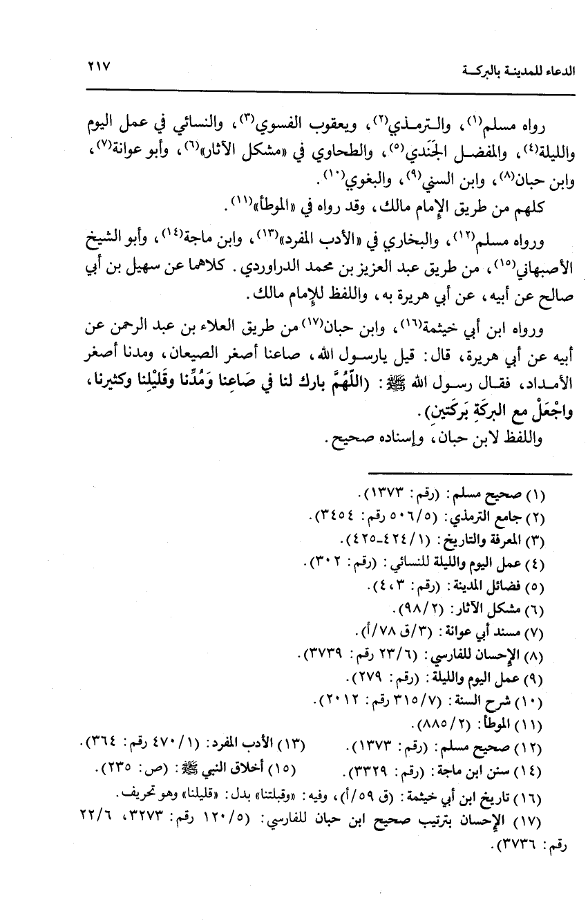 ورواه ابن أبي خيثمة (16)، وابن حبان (17)، من طريق العلاء بن عبد الرحمن عن أبيه عن أبي هريرة، قال: قيل يا رسول الله، صاعنا أصغر الصيعان، ومدنا أصغر الامداد، فقال رسول الله صلى الله عليه وسلم: (اللهم بارك لنا في صاعنا ومدنا وقليلنا وكثيرنا، واجعل مع البركة بركتين).