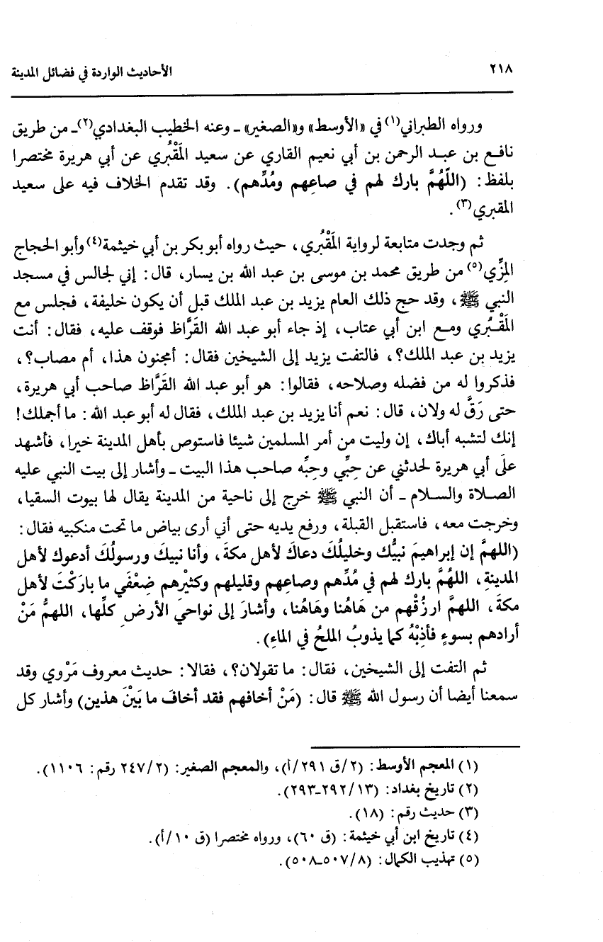 ثم وجدت متابعة لرواية المقبري، حيث رواه أبو بكر بن أبي خيثمة (4) وأبو الحجاج المزي (5) من طريق محمد بن موسى بن عبد الله بن يسار، قال: إني لجالس في مسجد النبي صلى الله عليه وسلم، وقد حج ذلك العام يزيد بن عبد الملك قبل أن يكون خليفة، فجلس مع المقبري ومع ابن أبي عتاب، إذ جاء أبو عبد الله القراظ فوقف عليه، فقال: أنت يزيد بن عبد الملك؟، فالتفت يزيد إلى الشيخين فقال: أمجنون هذا، أم مصاب؟، فذكروا له من فضله وصلاحه، فقالوا: هو أبو عبد الله القراظ صاحب أبي هريرة، حتى رق له ولان، قال: نعم أنا يزيد بن عبد الملك، فقال له أبو عبد الله: ما أجملك ! إنه لتشبه أباك، إن وليت من أمر المسلمين شيئا فاستوص بأهل المدينة خيراً، فأشهد على أبي هريرة لحدثني عن حبي وحبه صاحب هذا البيت - واشار إلى بيت النبي عليه الصلاة والسلام - أن النبي صلى الله عليه وسلم - ان النبي صلى الله عليه وسلم خرج إلى ناحية من المدينة يقال لها بيوت السقيا، وخرجت معه، فاستقبل القبلة، ورفع يديه حتى أني أرى بياض ما تحت منكبيه فقال: (اللهم إن إبراهيم نبيك وخليلك دعاك لأهل مكة، وأنا نبيك ورسولك أدعوك لأهل المدينة، اللهم بارك لهم في مدهم وصاعهم وقليلهم وكثيرهم ضعفي ما باركت لأهل مكة، اللهم أرزقهم من هاهنا وهاهنا، وأشار إلى نواحي الأرض كلها، اللهم من أرادهم بسوء فأذبه كما يذوب الملح في الماء).