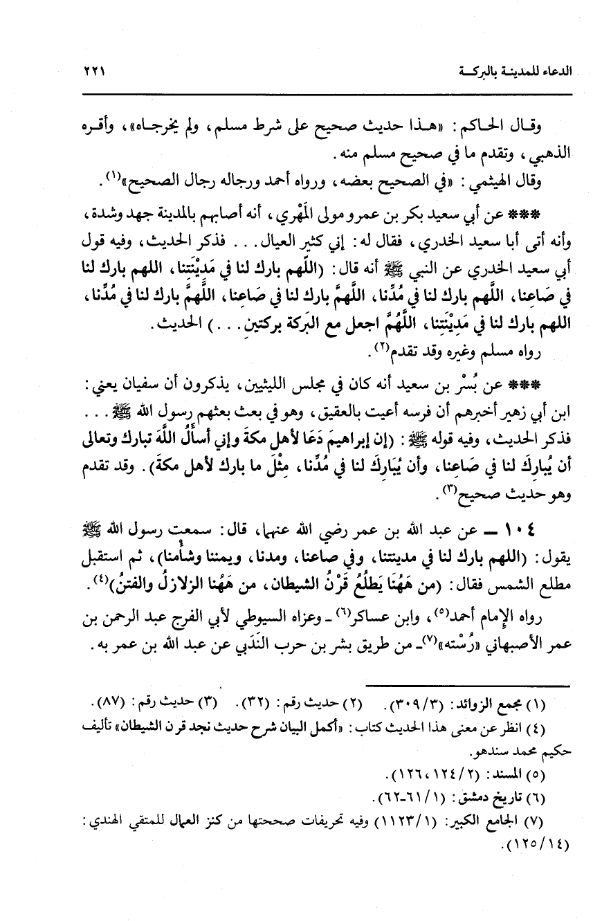 104 - عن عبد الله بن عمر رضي الله عنهما، قال: سمعت رسول الله صلى الله عليه وسلم يقول: (اللهم بارك لنا في مدينتنا، وفي صاعنا، ومدنا، وميننا وشامنا) ثم استقبل مطلع الشمس فقال: (من ههنا يطلع قرن الشيطان، من ههنا الزلازل والفتن) (4).