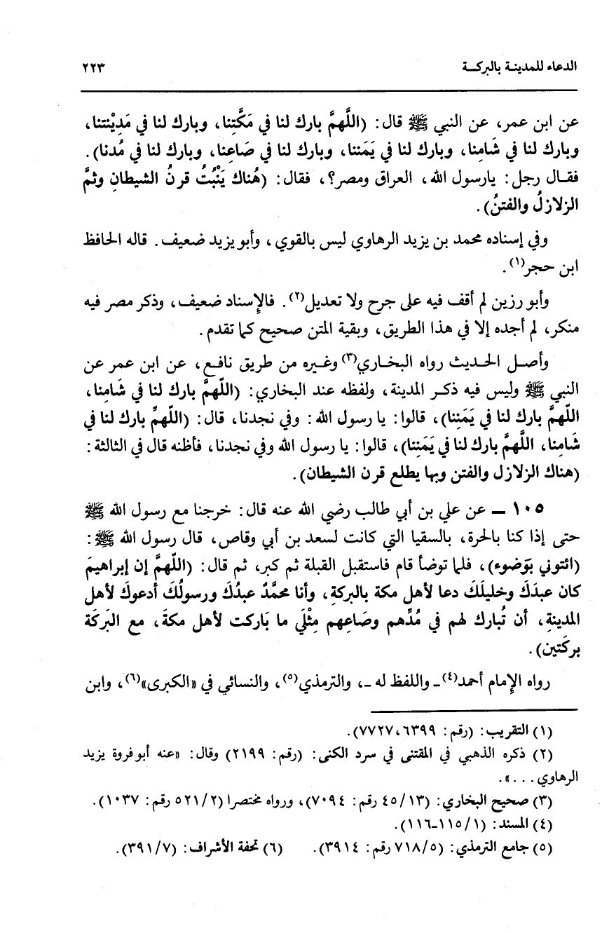 105 - عن علي بن أبي طالب رضي الله عنه قال: خرجنا مع رسول الله صلى الله عليه وسلم حتى إذا كنا بالحرة، بالسقيا التي كانت لسعد بن أبي وقاص، قال رسول الله صلى الله عليه وسلم: (ائتوني بوضوء)، فلما توضأ قام فاستقبل القبلة ثم كبر، ثم قال: (اللهم ان إبراهيم كان عبدك وخليلك دعا لأهل مكة بالبركة، وأنا محمد عبدك ورسولك أدعو لأهل المدينة، ان تبارك لهم في مدهم وصاعهم مثلي ما باركت لأهل مكة، مع البركة بركتين).