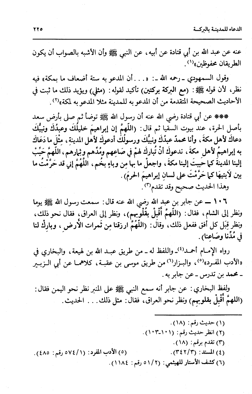 106 - عن جابر بن عبد الله رضي الله عنه قال: سمعت رسول الله صلى الله عليه وسلم يوما ونظر إلى الشام، فقال: (اللهم أقبل بقلوبهم)، ونظر إلى العراق، فقال نحو ذلك، ونظر قبل كل افق ففعل ذلك، وقال: (اللهم ارزقنا من ثمرات الارض، وبارك لنا في مدنا وصاعنا).