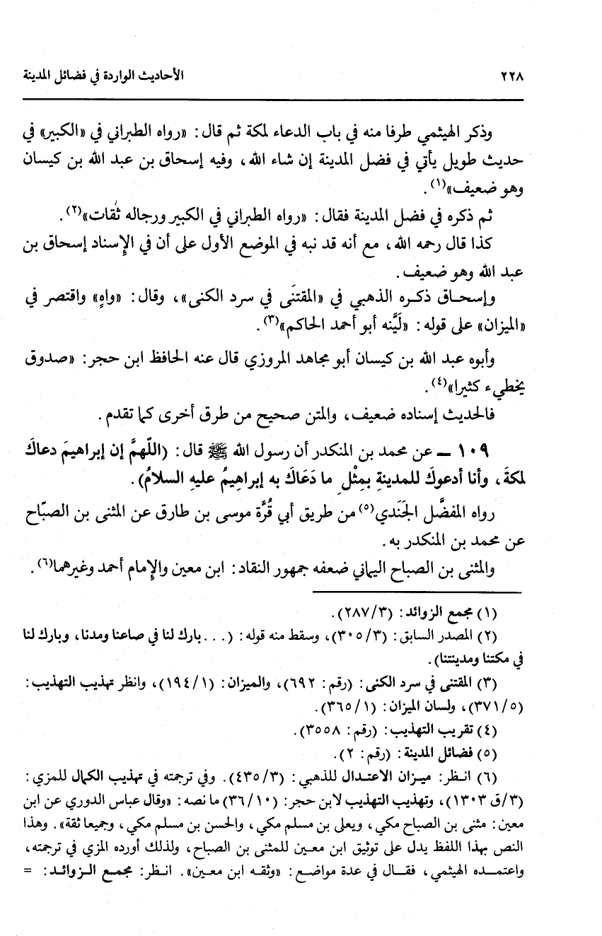 وذكر الهيثمي طرفا منه في باب الدعاء لمكة ثم قال: ((رواه الطبراني في ((الكبير)) في حديث طويل يأتي في فضل المدينة إن شاء الله، وفيه إسحاق بن عبد الله بن كيسان وهو ضعيف)) (1).
