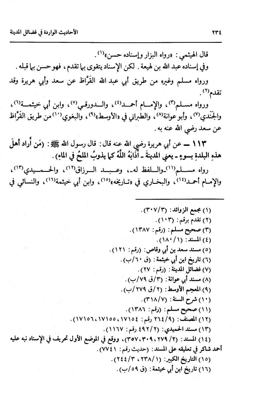 113 - عن أبي هريرة رضي الله عنه قال: قال رسول الله صلى الله عليه وسلم: (من أراد أهل هذه البلدة بسوء - يعني المدينة - أذابه الله كما يذوب الملح في الماء).