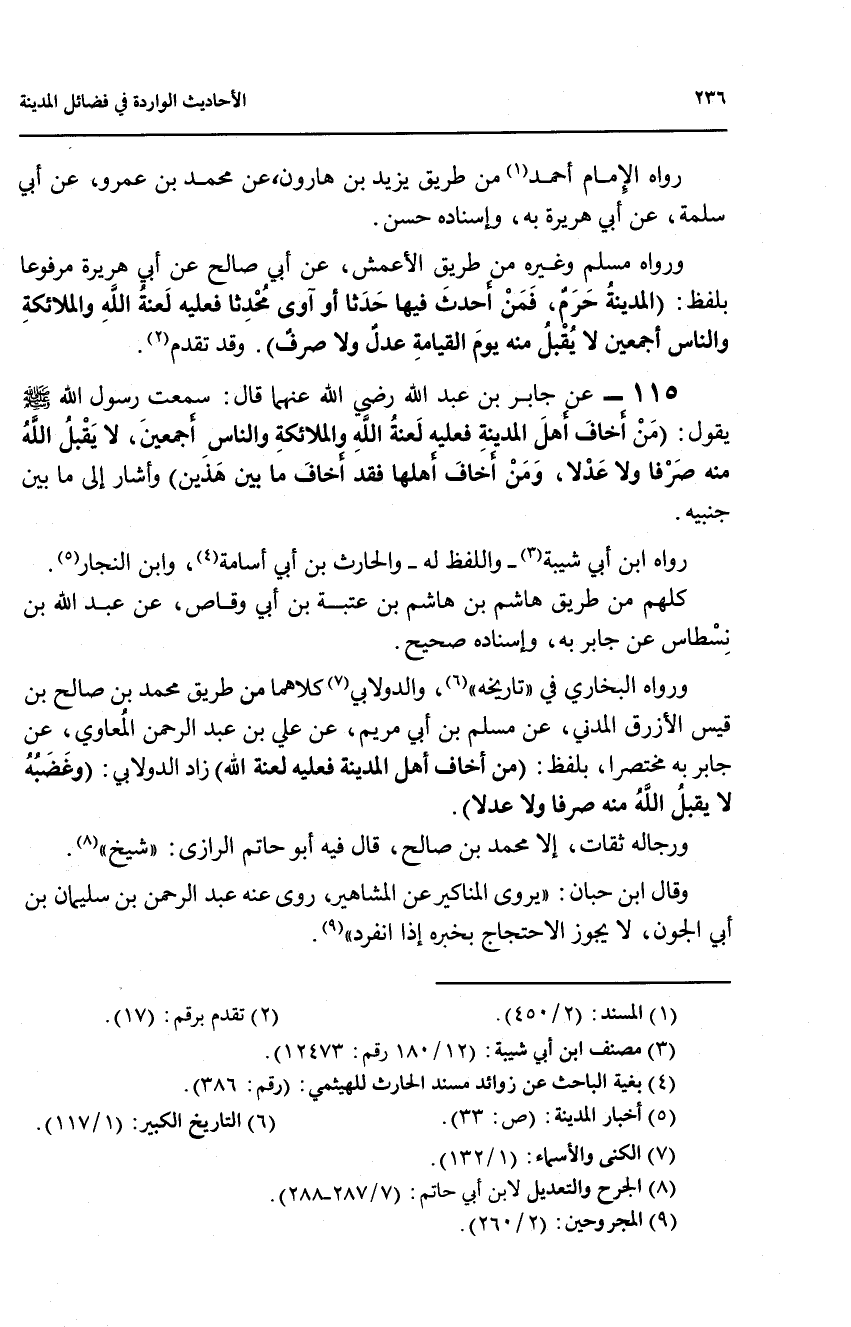 115 - عن جابر بن عبد الله رضي الله عنهما قال: سمعت رسول الله صلى الله عليه وسلم يقول: (من أخاف أهل المدينة فعليه لعنة الله والملائكة والناس أجمعين، لا يقبل الله منه صرفاً ولا عدلاً، ومن أخاف اهلها فقد أخاف ما بين هذين) وأشار إلى ما بين جنبيه.