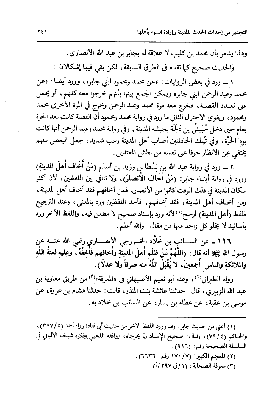 2 - ورد في رواية عبد الله بن نسطاس وزيد بن أسلم (من أخاف أهل المدينة) وورد في رواية ابناء جابر: (من أخاف الأنصار)، ولا تنافي بين اللفظين، لان اكثر سكان المدينة في ذلك الوقت كانوا من الأنصار، فمن أخافهم فقد أخاف أهل المدينة، ومن أخاف أهل المدينة، فقد أخافهم، فأحد اللفظين ورد بالمعنى، وعند الترجيح فلفظ (أهل المدينة) أرجح (1) لانه ورد بإسناد صحيح لا مطعن فيه، واللفظ الاخر ورد بأسانيد لا يخلو كل واحد منها من مقال. والله أعلم.