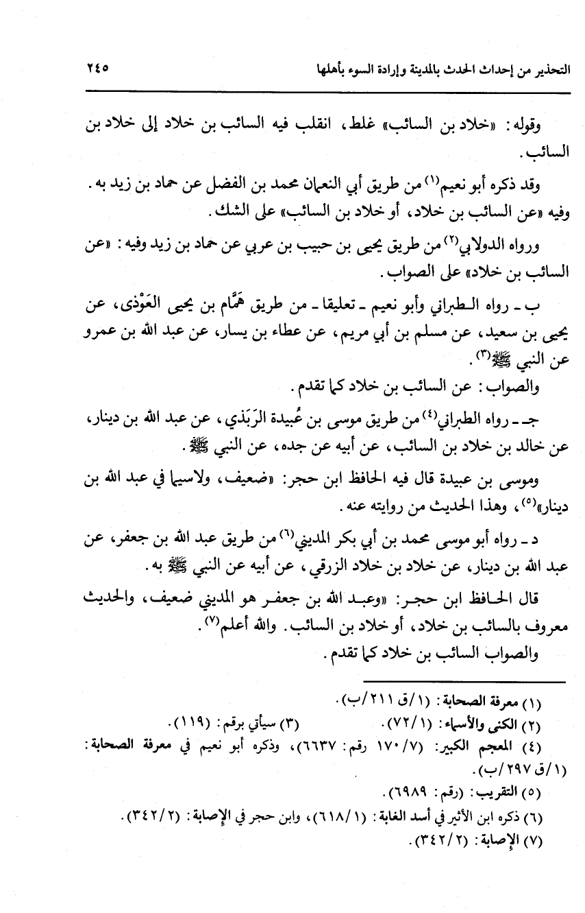 وقد ذكره أبو نعيم (1) من طريق أبي النعمان محمد بن الفضل عن حماد بن زيد به وفيه ((السائب بن خلاد، أو خلاد بن السائب)) على الشك.