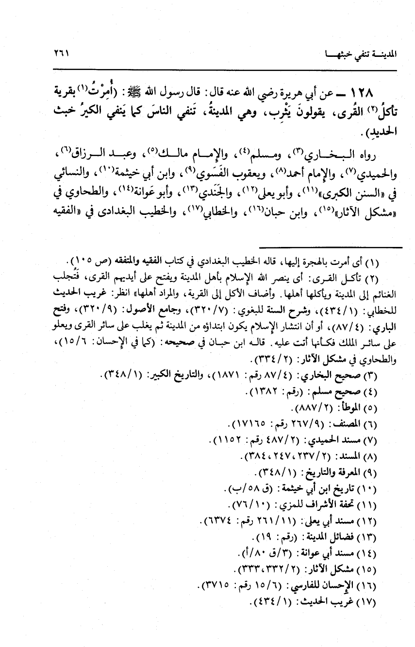 128 - عن أبي هريرة رضي الله عنه قال: قال رسول الله صلى الله عليه وسلم: (أمرت (1) بقرية تأكل (2) القرى، يقولون يثرب، وهي المدينة، تنفي الناس كما ينفي الكير خبث الحديد).