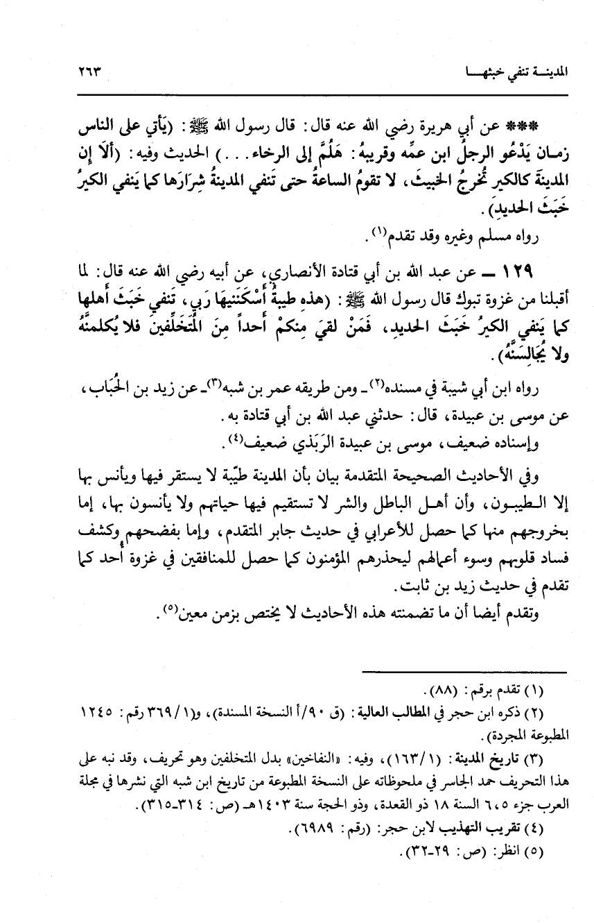 129 - عن عبد الله بن أبي قتادة الأنصاري، عن أبيه رضي اللهعنه قال: لما أقبلنا من غزوة تبوك قال رسول الله صلى الله عليه وسلم: (هذه طيبة أسكننيها ربي، تنفي خبث أهلها كما ينفي الكير خبث الحديث، فمن لقي منكم أحدا من المتخلفين فلا يكلمنه ولا يحالسنه).