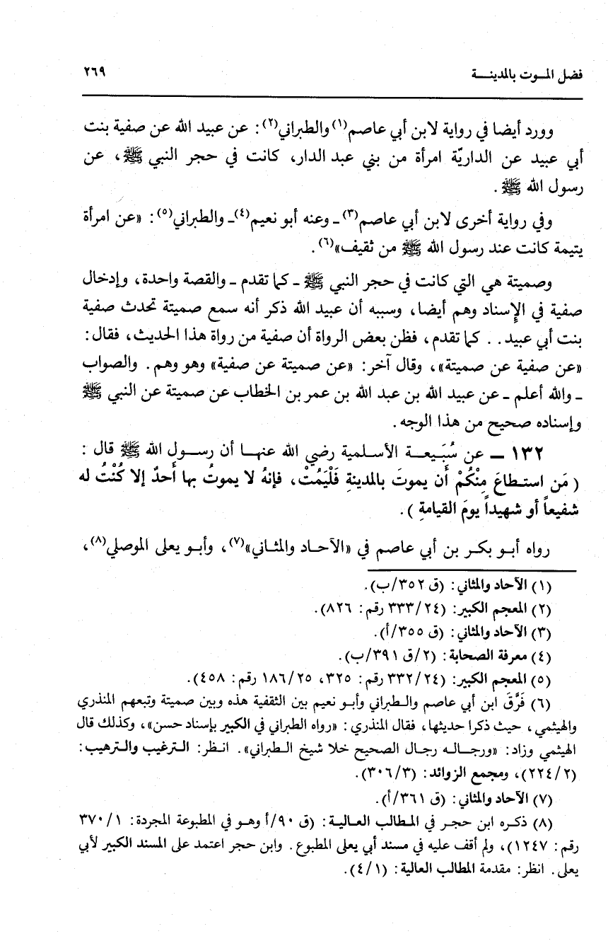 132 - عن سبيعة الأسلمية رضي الله عنها أن رسول الله صلى الله عليه وسلم قال: (من استطع منكم ان يموت بالمدينة فليمت، فإنه لا يموت بها أحد الا كنت له شفيعاً أو شهيداً يوم القيامة).