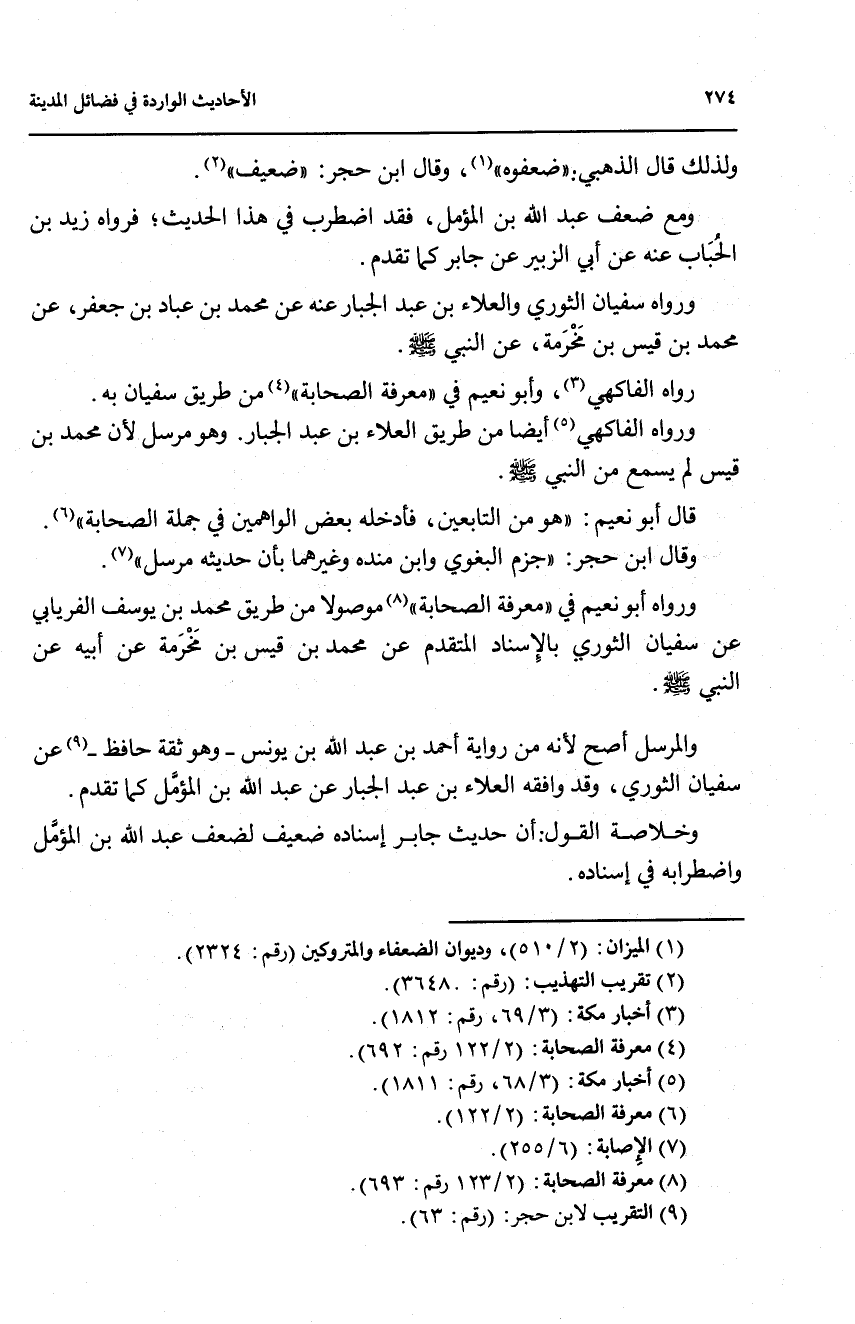 ورواه الفاكهي (5) أيضاً من طريق العلاء بن عبد الجبار، وهو مرسل لان محمد بن قيس لم يسمع مع النبي صلى الله عليه وسلم.
