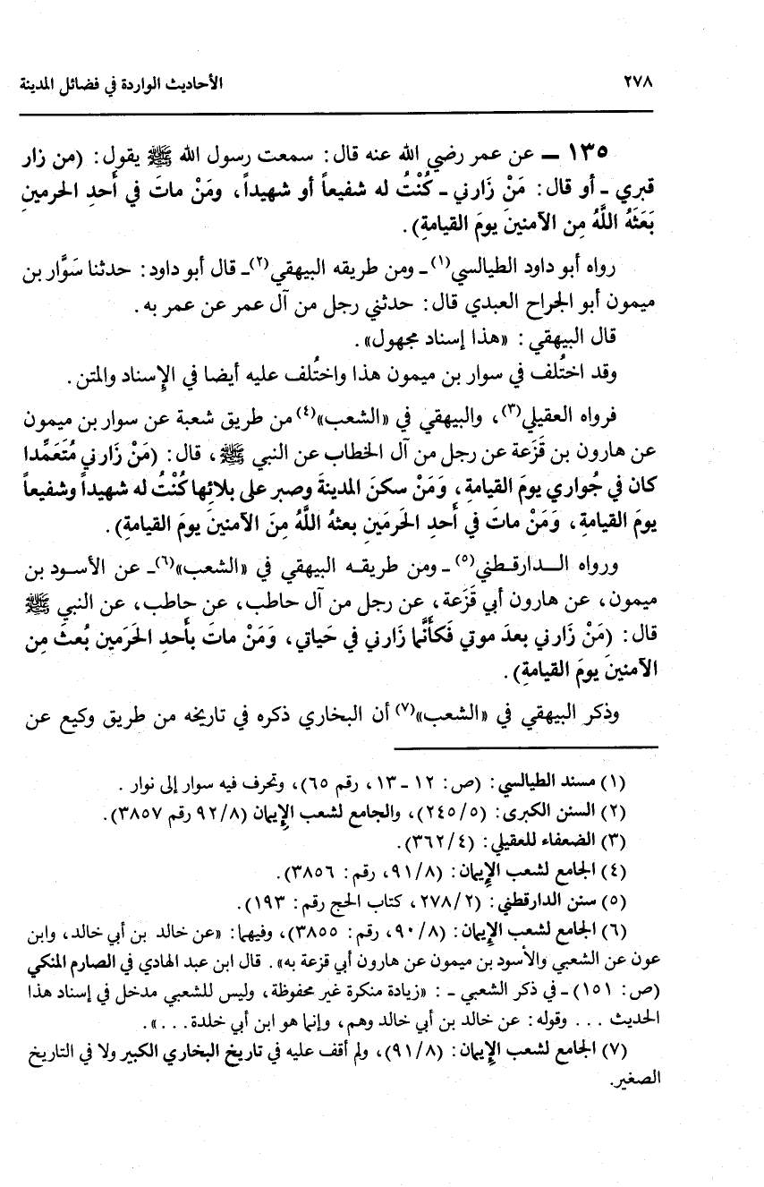 135 - عن عمر رضي الله عنه قال: سمعت رسول الله صلى الله عليه وسلم يقول: (من زار قبري - أوقال: من زارني - كنت له شفيعاً أو شهيدا، ومن مات في أحد الحرمين بعثه الله من الامنين يوم القيامة).