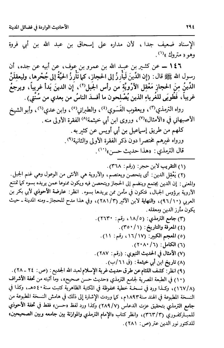 146 - عن كثير بن عبد الله بن عمرو بن عوف، عن أبيه عن جده، أن رسول الله صلى الله عليه وسلم قال: (إن الدين ليأرز إلى الحجاز، كما تأرز الحية إلى جحرها، وليعقلن الدين من الحجاز معقل الأروية من رأس الجبل (2)، إن الدين بدأ غريباً، ويرجع غريباً، فطوبى للغرباء الذين يصلحون ما أفسد الناس من بعدي من سنتي).