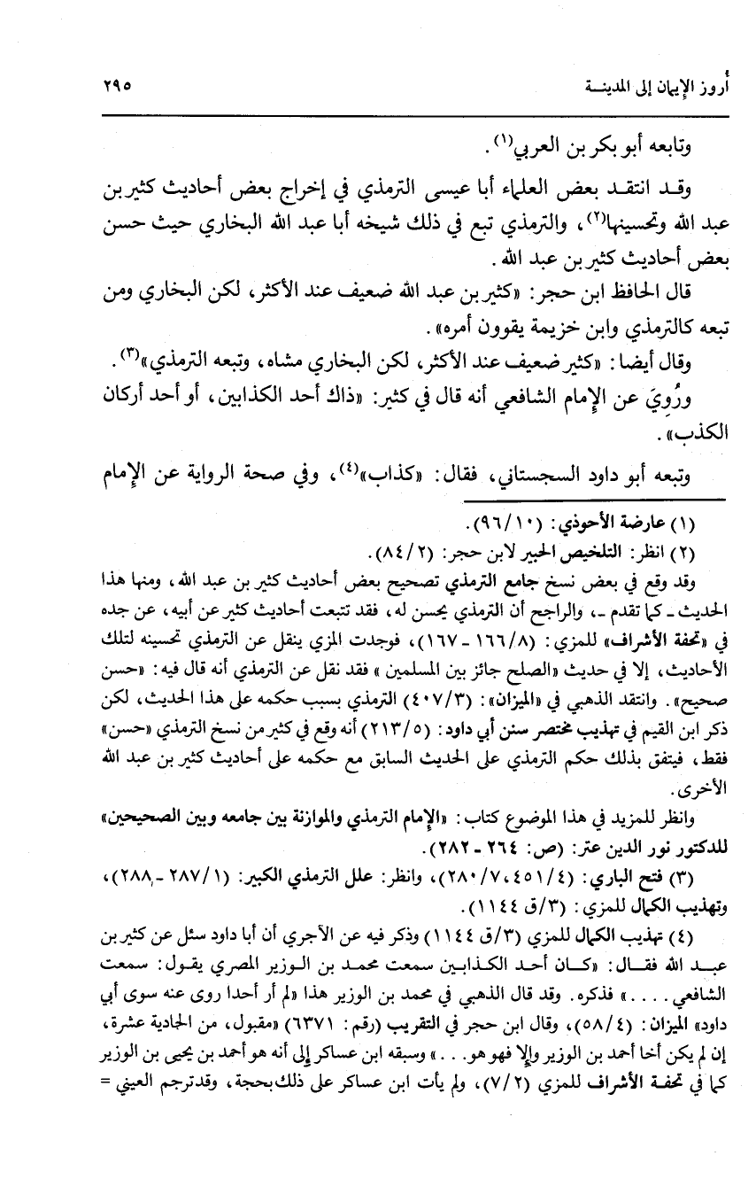 وقد انتقد بعض العلماء أبا عيسى الترمذي في إخراج بعض أحاديث كثير بن عبد الله وتحسينها (2)، والترمذي تبع في ذلك شيخه أبا عبد الله البخاري حيث حسن بعض أحاديث كثير بن عبد الله.