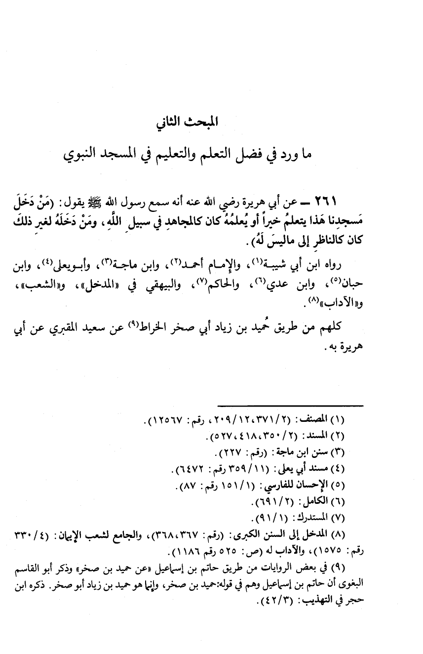 261 - عن أبي هريرة رضي الله عنه انه سمع رسول الله صلى الله عيله وسلم يقول: (من دخل مسجدنا هذا يتعلم خيرا او يعلمه كان كالمجاهد في سبيل الله, ومن دخله لغير ذلك كان كالناظر إلى ماليس له).