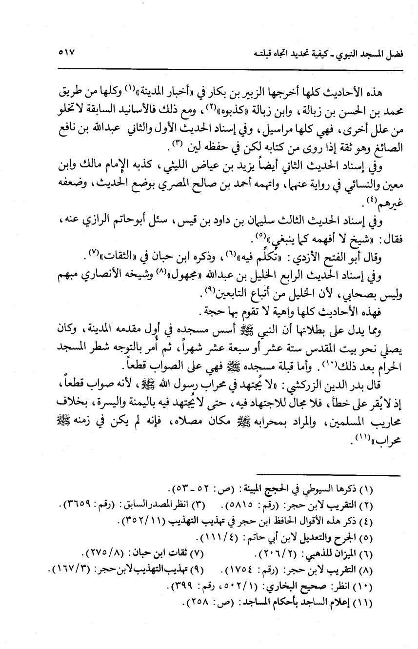 وما يدل على بطلانها ان النبي صلىالله عليه وسلم اسس مسجده في اول مقدمه المدينة, وكان يصلي نحو بيت المقدس ستة عشر او سبعة عشر شهرا, ثم امر بالتوجه شطر المسجد الحرام بعد ذلك (10).