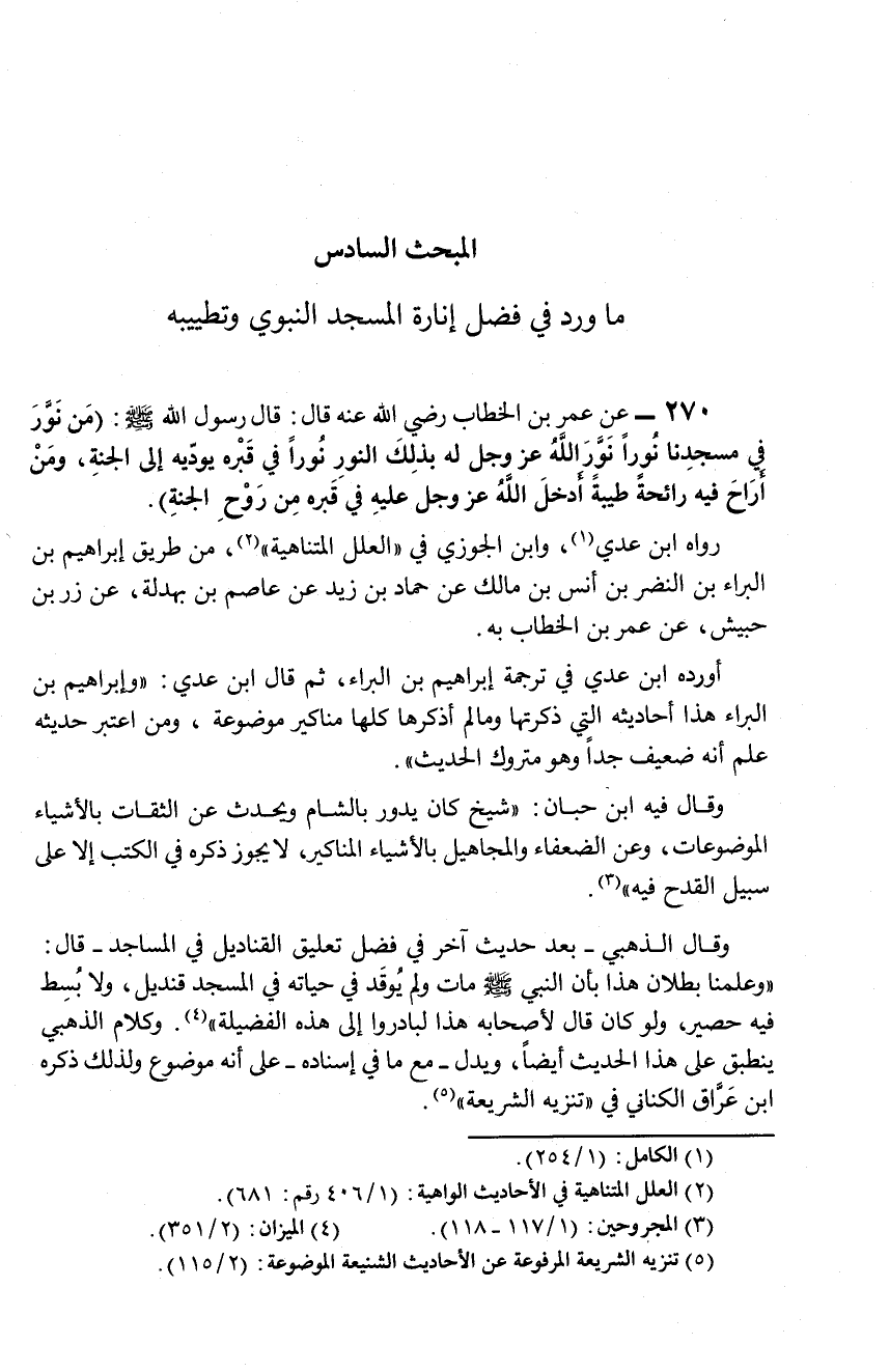 270 - عن عمر بن الخطاب رضي الله عنه قال: قال رسول الله صلى الله عليه وسلم: (من نور في مسجدنا نوراً نور الله عز وجل له بذلك النور نوراً في قبره يوديه إلى الجنة، ومن أراح فيه رائحة طيبة أدخل الله عز وجل عليه في قبره من روح الجنة).