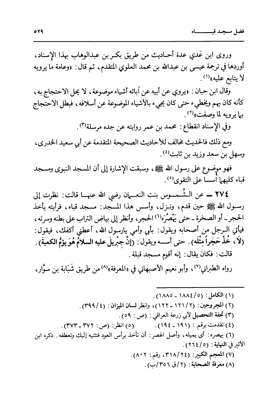 274 - عن الشموس بنت النعمان رضي الله عنها قالت: نظرت إلى رسول الله صلى الله عليه وسلم حين قدم، ونزل، وأسس هذا المسجد: مسجد قباء، فرأيته يأخذ الحجر - أو الصخرة - حتى يهصره (6) الحجر، وأنظر إلى بياض التراب على بطنه وسرته، فيأتي الرجل من أصحابه ويقول: بأبي وأمي يا رسول الله، اعطني أكفك، فيقول: (لا، خذ حجراً مثله). حتى أسسه ويقول: (إن جبريل عليه السلام هو يؤم الكعبة).