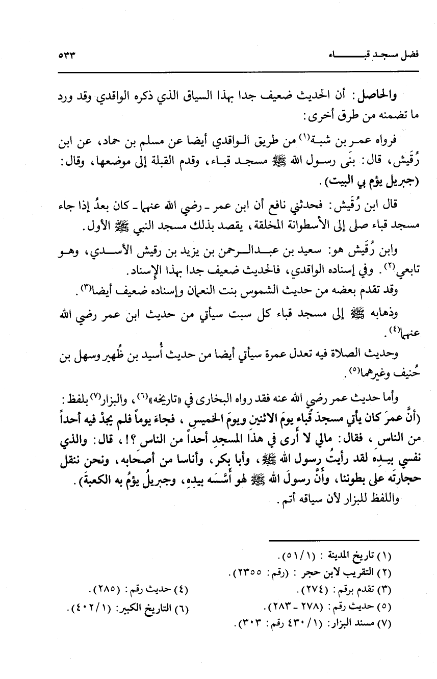 والحاصل: أن الحديث ضعيف جدا بهذا السياق الذي ذكره الواقدي وقد ورد ما تضمنه من طرق أخرى: فرواه عمر بن شبة (1) من طريق الواقدي أيضاً عن مسلم بن حماد، عن ابن رقيش، قال بنى رسول الله صلى الله عليه وسلم مسجد قباء، وقدم القبلة إلى موضعها، وقال: (جبريل يؤم بي البيت).