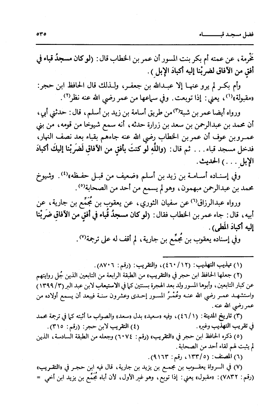 مخرمة، عن عمته أم بكر بنت المسور أن عمر بن الخطاب قال: (لو كان مسجد قباء في افق من الافاق لضربنا إليه أكباد الابل).