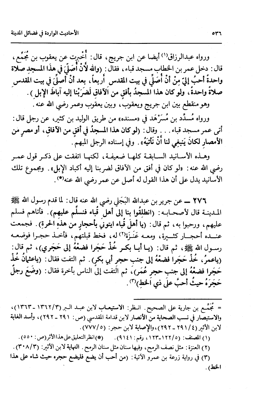 ورواه عبد الرزاق (1) أيضاً عن ابن جريج، قال: اخبرت عن يعقوب بن مجمع، قال: دخل عمر بن الخطاب مسجد قباء، فقال: (والله لأن اصلي في هذا المسجد صلاة واحدة احب الي من ان اصلي في بيت المقدس أربعاً، بعد ان صلى في بيت المقدس صلاة واحدة، ولو كان هذا المسجد بأفق من الافاق لضربنا إليه آباط الابل).