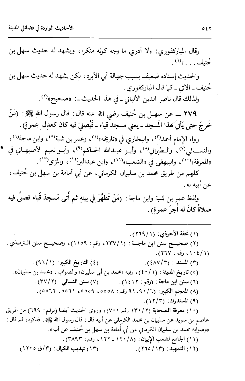 279 - عن سهل بن حنيف رضي الله عنه قال: قال رسول الله صلى الله عليه وسلم: (من خرج حتى يأتي هذا المسجد - يعني مسجد قباء - فيصلي فيه كان كعدل عمره) رواه الإمام أحمد (3)، والبخاري في ((تاريخه)) (4)، وعمر بن شبة (5)، وابن ماجة (6)، والنسائي (7)، والطبراني (8) , وأبوعبد الله الحاكم (9)، وأبو نعيم الأصبهاني في ((المعرفة)) (10)، والبيهقي في ((الشعب)) (11)، وابن عبد البر (12)، والمزي (13).