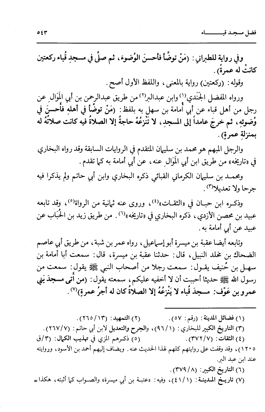 وتابعه أيضاً عقبة بن ميسرة أبو إسماعيل، رواه عمر بن شبة، من طريق أبي عاصم الضحاك بن مخلد النبيل، قال: حدثنا عقبة بن ميسرة، قال: سمعت أبا أمامة بن سهل بن حنيف يقول: سمعت رجلا من أصحاب النبي صلى الله عليه وسلم يقول: سمعت من رسول الله صلى الله عليه وسلم حديثاً أحببت ان لا اخفيه عليكم، سمعته يقول: (من أتى مسجد بني عمرو بن عوف: مسجد قباء لا ينزعه الا الصلاة كان له اجر عمرة) (7).