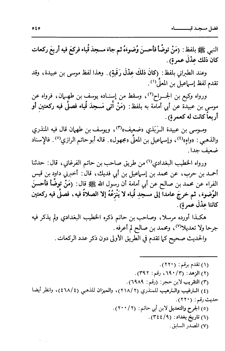 ورواه الخطيب البغدادي (6) من طريق صاحب بن حاتم الفرغاني، قال: حدثنا أحمد بن حرب، عن محمد بن إسماعيل بن أبي فديك، قال: أخبرني داود بن قيس الفراء عن محمد بن صالح عن أبي امامة ان رسول الله صلى الله عليه وسلم قال: (من توضأ فأحسن الوضوء، ثم خرج عامد الىمسجد قباء لا ينزعه الصلاة فيه، فصلى فيه ركعتين كانتا عدل عمرة) هكذا أورده مرسلا، وصاحب بن حاتم ذكره الخطيب البغدادي ولم يذكر فيه جرحا ولاتعديلا (7) ومحمد بن صالح لم اعرفه.