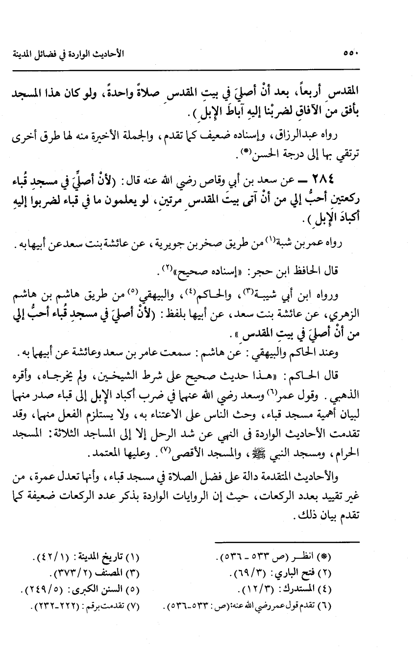 قال الحاكم: ((هذا حديث صحيح على شرط الشيخين، ولم يخرجاه، وأقره الذهبي، وقول عمر (6) وسعد رضي الله عنهما في ضرب أكباد الابل إلى قباء صدر منهما لبيان اهمية مسجد قباء، وحث الناس على الاعتناء به، ولا يستلزم الفعل منهما، وقد تقدمت الأحاديث الواردة في النهي عن شد الرحل الا إلى المساجد الثلاثة: المسجد الحرام، ومسجد النبي صلىالله عليه وسلم، والمسجد الأقصى (7)، وعليها المعتمد.