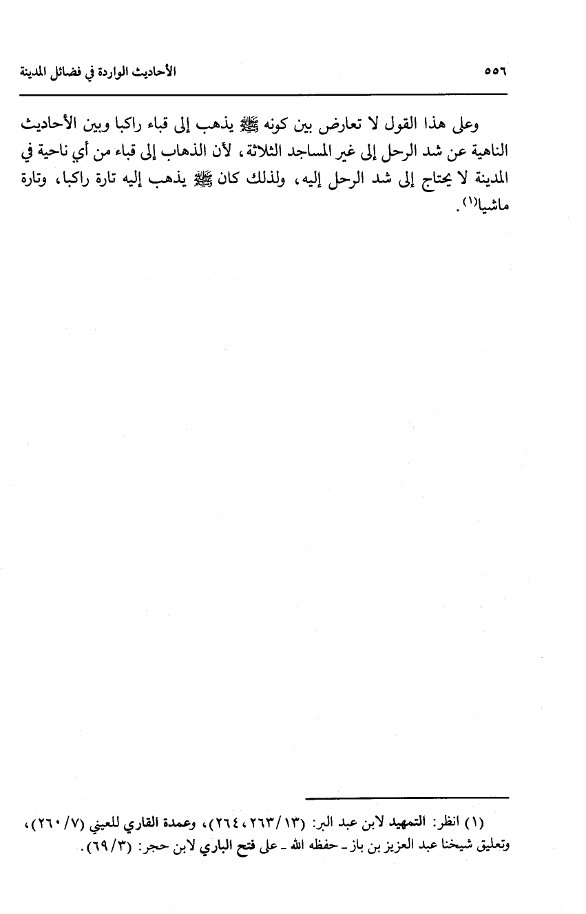 وعلى هذا القول لا تعارض بين كونه صلى الله عليه وسلم يذهب إلى قباء راكبا وبين الأحاديث الناهية عن شد الرحل إلى غير المساجد الثلاثة, لان الذهاب إلى قباء من اي ناحية في المدينة لا يحتاج إلى شد الرحل اليه, ولذلك كان صلى الله عليه وسلم اليه تارة راكبا, وتارة ماشيا (1).