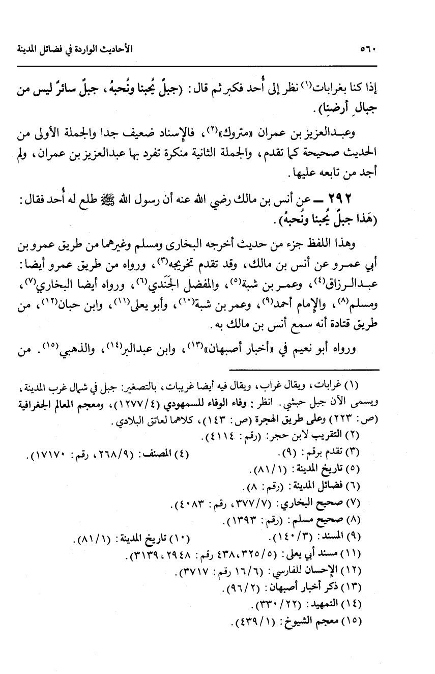 292 - عن أنس بن مالك رضي الله عنه ان رسول الله صلى الله عليه وسلم طلع له أحد فقال: (هذ جبل يحبنا ونحبه).
