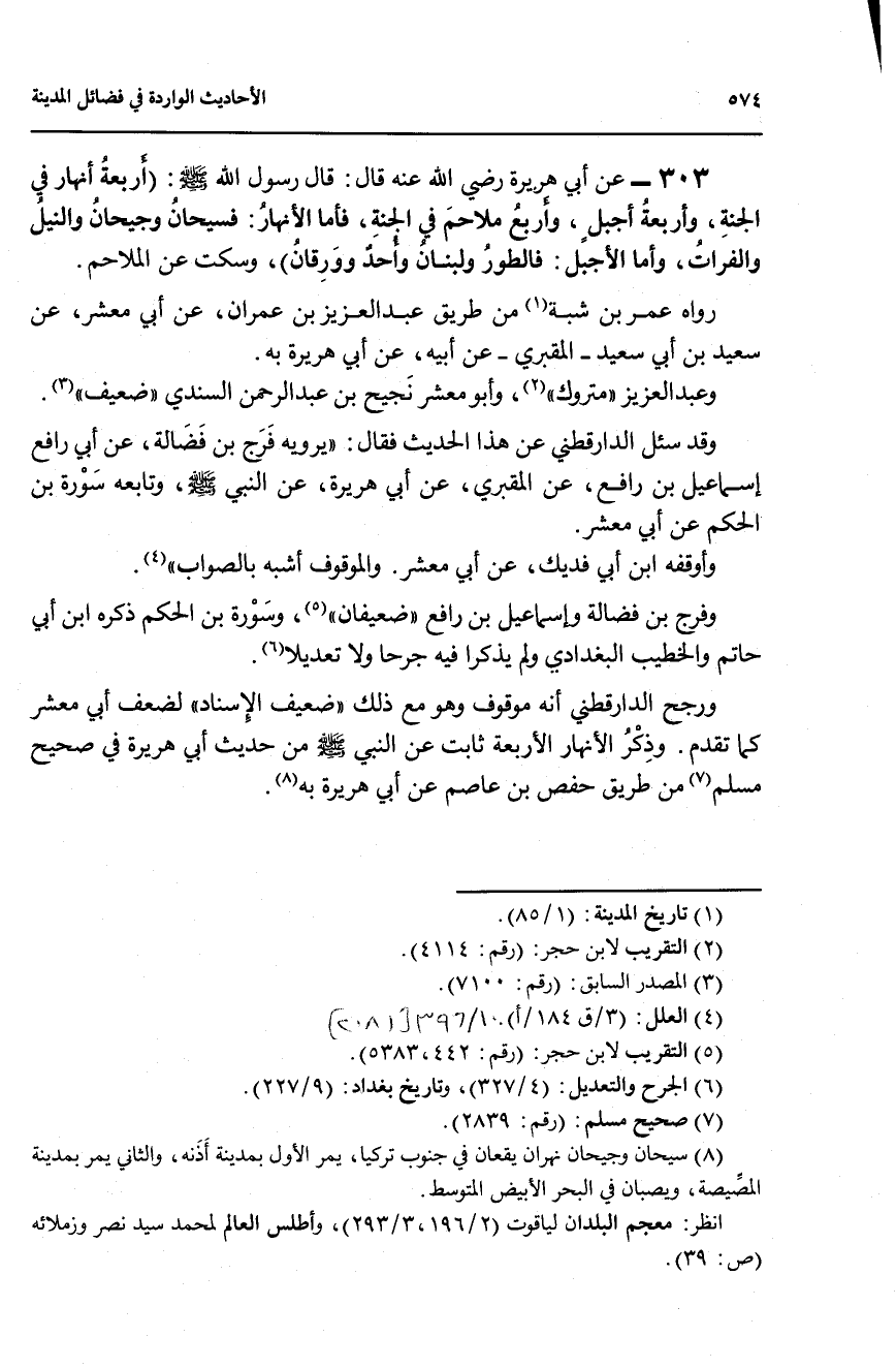 303 - عن أبي هريرة رضي الله عنه قال: قال رسول الله صلى الله عليه وسلم: (أربعة انهار في الجنة، وأربعة أجبل، وأربع ملاحم في الجنة، فأما الأنهار: فسيحان وجيحان والنيل والفرات، وأما الأجبل: فالطور ولبنان واحد وورقان)، وسكت عن الملاحم.