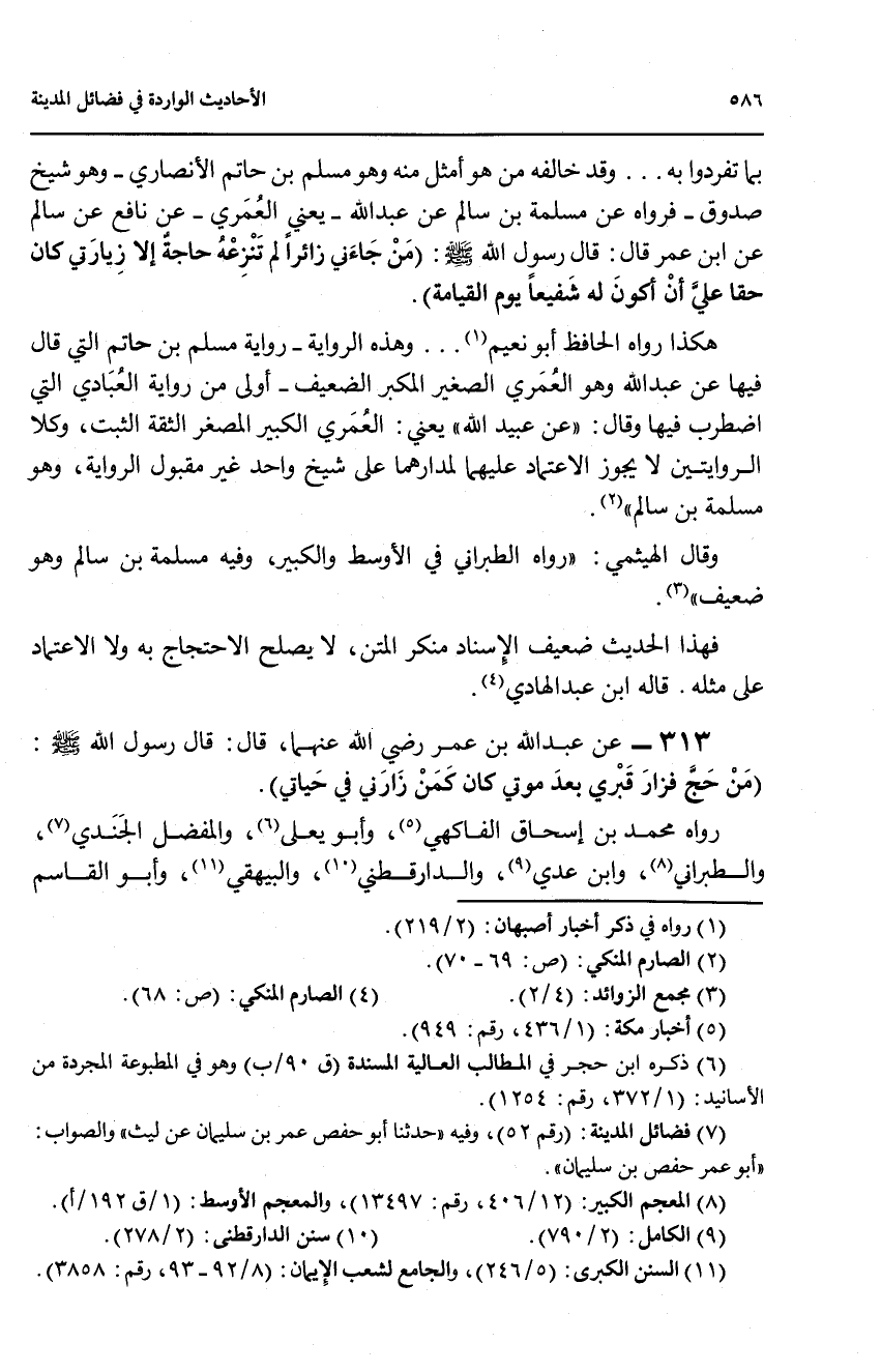 بما تفردوا به ... وقد خالفه من هو امثل منه وهو مسلم بن حاتم الانصاري - وهو شيخ صدوق _ فرواه عن مسلمة بن سالم عن عبد الله - يعني العمري - عن نافع عن سالم عن ابن عمر قال: قال رسول الله صلى الله عليه وسلم: (من جاءني زائراً لم تنزعه حاجة الا زيارتي كان حقا على انم اكون له شفيعاً يوم القيامة).