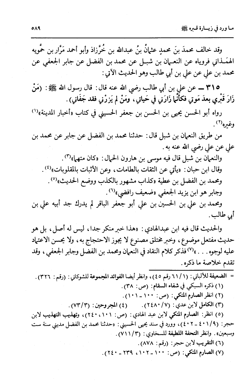 315 - عن علي بن ابيطالب رضي الله عنه قال: قال رسول الله صلى الله عليه وسلم: (من زار قبري بعد موتي فكانما زارني في حياتي, ومن لم يزرني فقد جفاني).