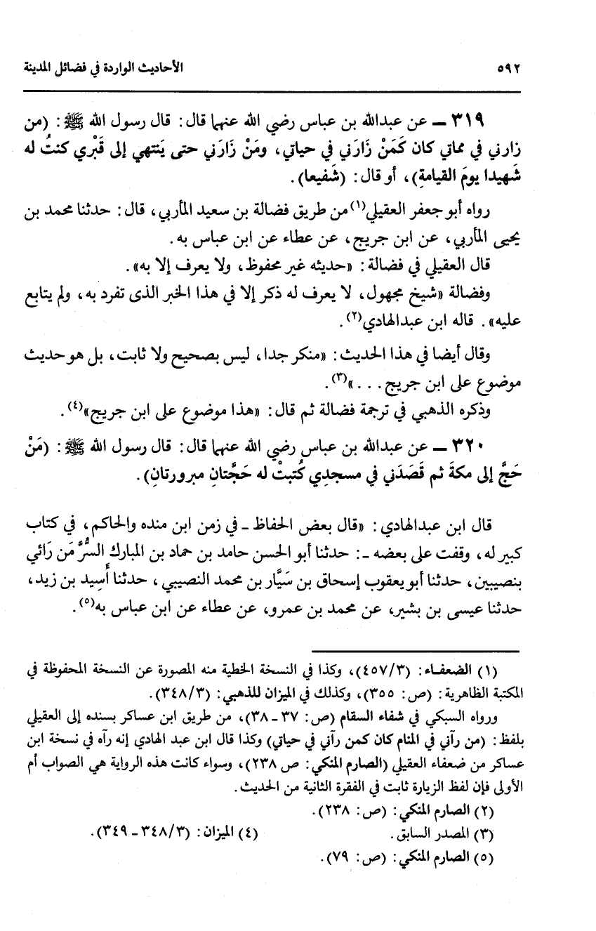 319 - عن عبدالله بن عباس رضي الله عنهما قال: قال رسول الله صلى الله عليه وسلم: (من زارني في مماتي كمن زارني في حياتي, ومن زارني حتى ينتهي إلى قبري كنت له شهيدا يوم القيامة) ,او قال: (شفيعا).