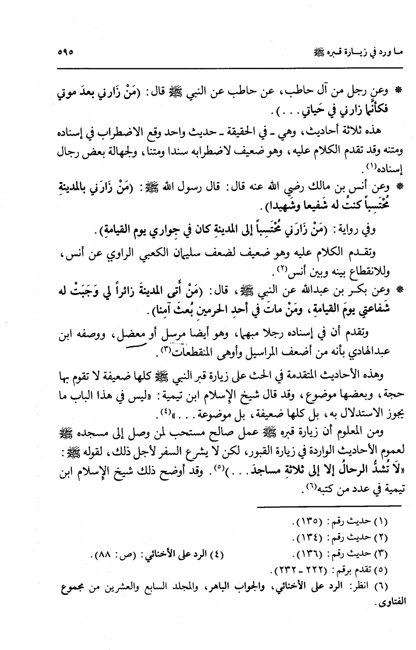 وهذه الأحاديث المتقدمة في الحث على زيارة قبر النبي صلى الله عليه وسلم كلها ضعيفة لا تقوم بها حجة, وبعضها موضوع, وقد قال شيخ الإسلام ابن تميمة: ((ليس في هذا الباب ما يجوز الاستدلال به، بل كلها ضعيفة, بل موضوعة ... )) (4).