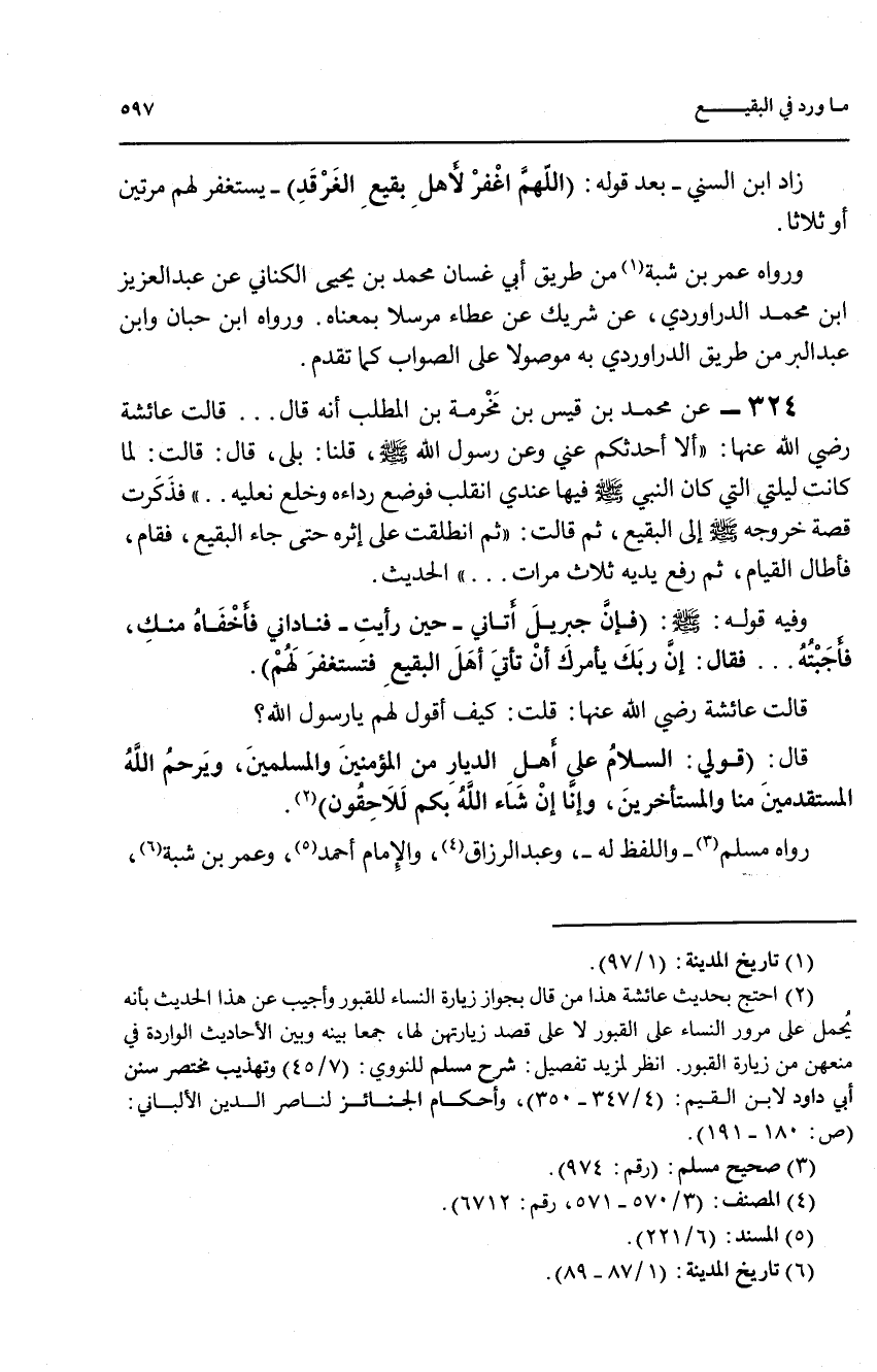 324 - عن محمد بن قيس بن مخرمة بن المطلب انه قال ... قالت عائشة رضي الله عنها: ((الا أحدثكم عني وعن رسول الله صلى الله عليه وسلم, قلنا: بلى, قال: قالت: لما كانت ليلتي التي كان النبي صلى الله عليه وسلم فيها عندي انقلب فوضع رداء وخلع نعليه ... )) فذكرت قصة خروجه صلى الله عليه وسلم إلى البقيع, ثم قالت: (ثم انطلقت على اثره حتى جاء البقيع, فقال, فاطال القيام, ثم رفع يده ثلاث مرات ... )) الحديث.