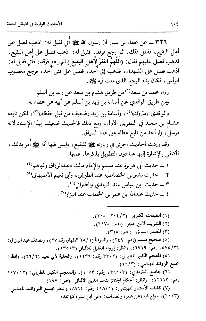 326 - عن عطاء بن يسار ان رسول الله صلى الله عليه وسلم أتي فقيل له: اذهب فصل على أهل البقيع، ففعل ذلك، ثم رجع فرقد، فقيل له: اذهب فصل على أهل البقيع، فذهب فصلى عليم فقال: (اللهم اغفر لأهل البقيع) ثم رجع فرقد، فأتي فقيل له: اذهب فصل على الشهداء، فذهب إلى أحد، فصلى على قتلى أحد، فرجع معصوب الرأس، فكاء بدء الوجع الذي مات فيه صلى الله عليه وسلم.