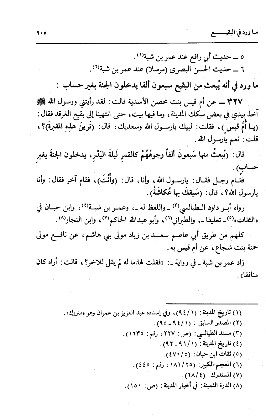 327 - عن أم قيس بنت محصن الأسدية قالت: لقد رأيتني ورسول الله صلى الله عليه وسلم آخذ بيدي في بعض سكك المدينة، وما فيها بيت، حتى انتهينا إلى بقيع الغرقد فقال: (يا أم قيس)، فقلت: لبيك يا رسول الله وسعديك، قال: (ترين هذه المقبرة)؟، قلت: نعم يا رسول الله.