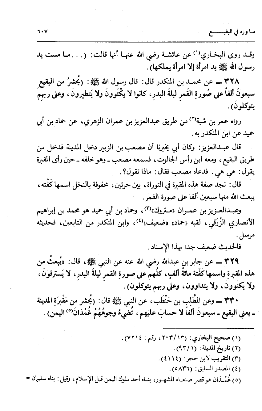 330 - وعن المطلب بن حنطب، عن النبي صلى الله عليه وسلم قال: (يحشر من مقبرة المدينة - يعني البقيع - سبعون الفا لا حساب عليهم، تضي وجوههم غمدان (5) اليمن).