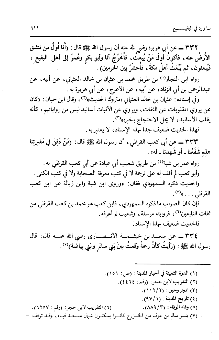 333 - عن أبي كعب القرظي، أن رسول الله صلى الله عليه وسلم قال: (من دفن في مقبرتنا هذه شفعنا - أو شهدنا له)).