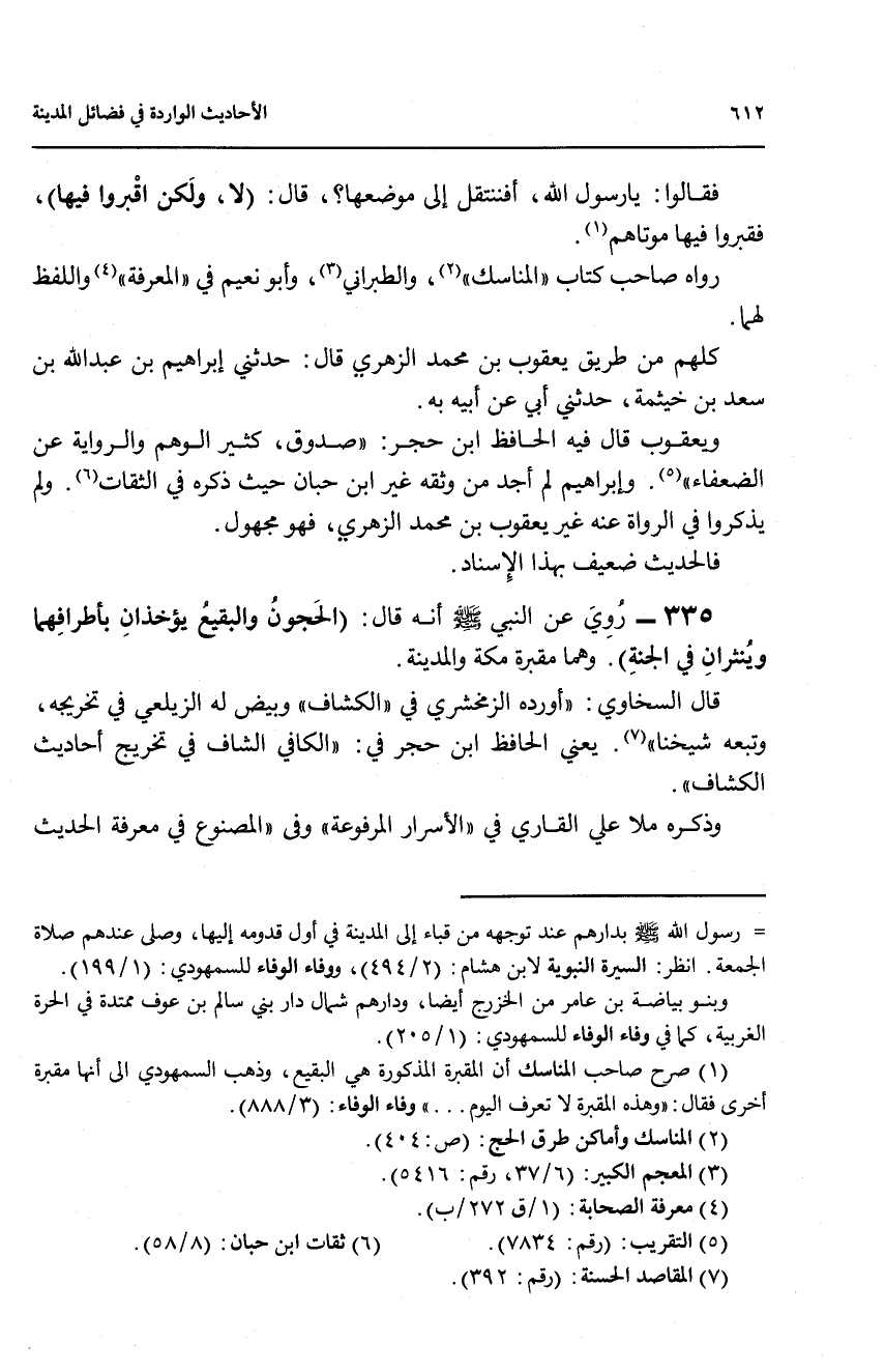 335 - روي عن النبي صلى الله عليه وسلم أنه قال: (الحجون والبقيع يؤخذان بأطرافهما وينثران في الجنة). وهما مقبرة مكة والمدينة.