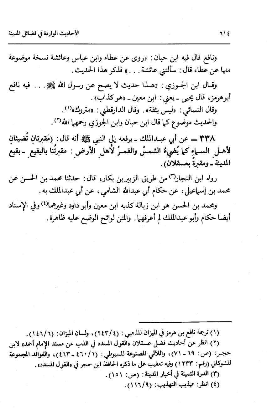 ومحمد بن الحسن هو ابن زبالة كذبة ابن معين وأبو داود وغيرهما (4) وفي الإسناد أيضا حكام وأبو عبد الملك لم أعرفهما، والمتن في لوائح الوضع عليه ظاهرة.