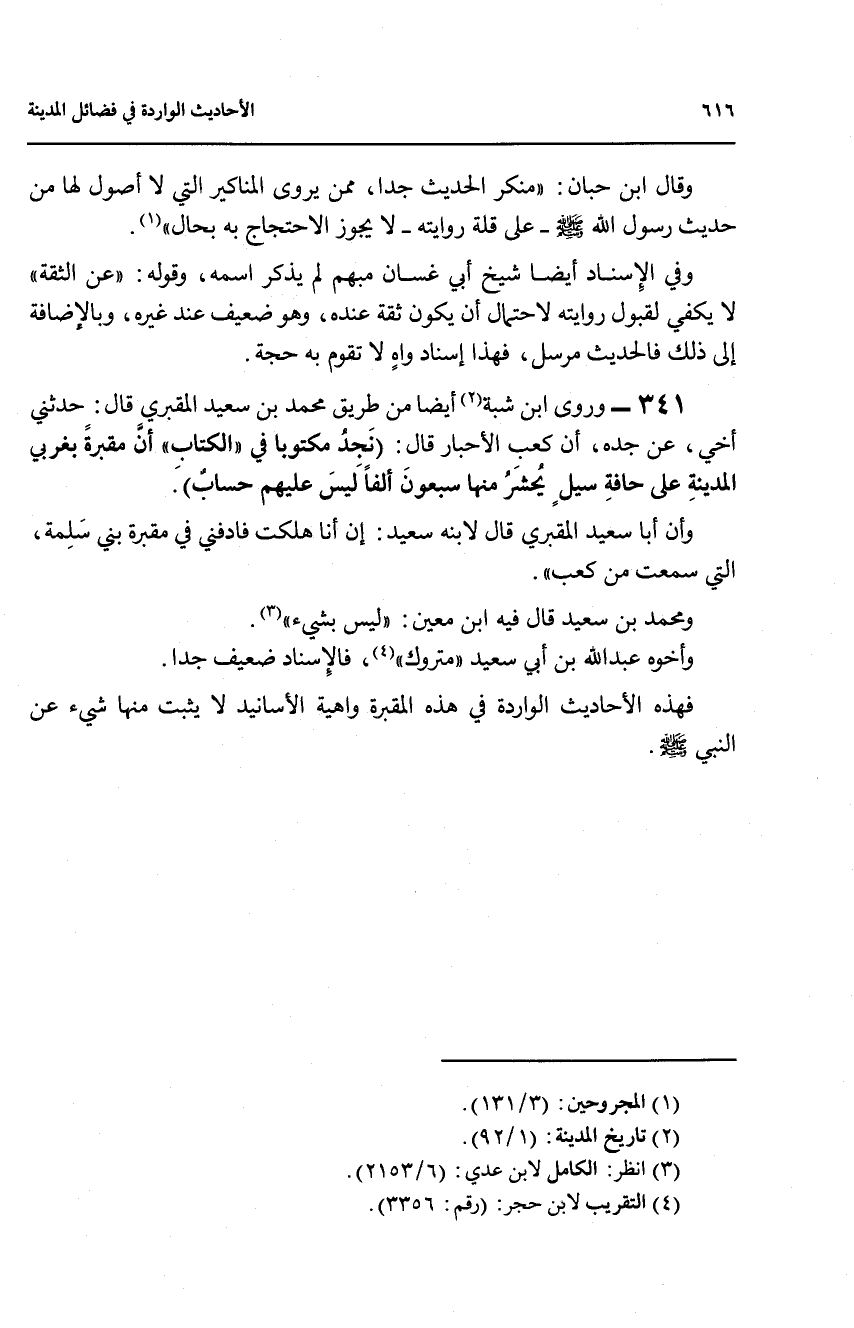 341 - وروى ابن شبة (2) أيضاً من طريق محمد بن سعيد المقبري قال: حدثني اخي, عن جده, ان كعب الاحبار قال: (نجد مكتوبا في ((الكتاب)) ان مقبرة بغربي المدينة على حافة سيل يحشر منها سبعون الفا ليس عليهم حساب).