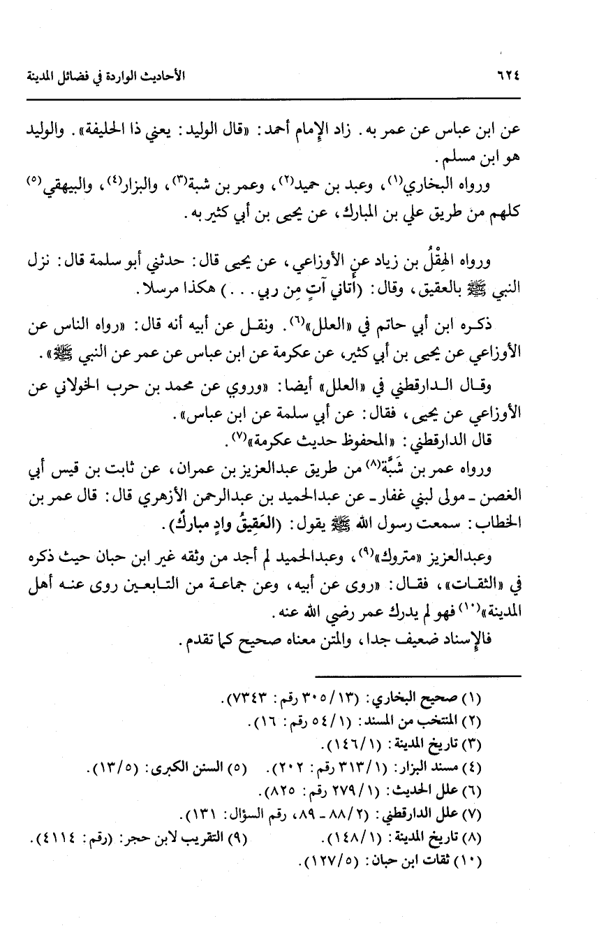 ورواه عمر بن شبة (8) من طريق عبد العزيز بن عمران، عن ثابت بن قيس أبي الغصن - مولى لبني غفار - عن عبد الحيمد بن عبد الرحمن الأزهري قال: قال عمر بن الخطاب: سمعت رسول الله صلى الله عليه وسلم يقول: (العقيق واد مبارك).