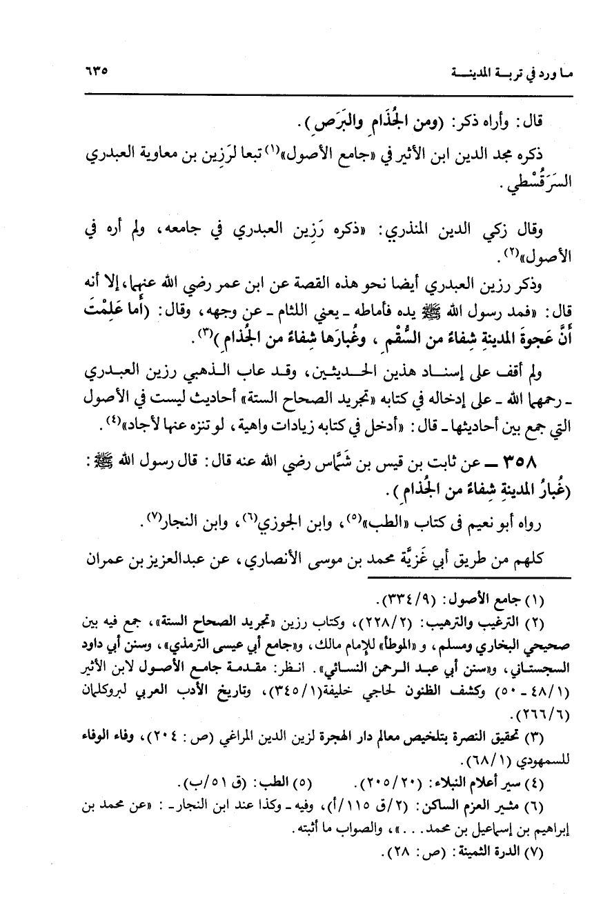 358 - عن ثابت بن قيس بن شماس رضي الله عنه قال: قال رسول الله صلى الله عليه وسلم: (غبار المدينة شفاء من الجذام).